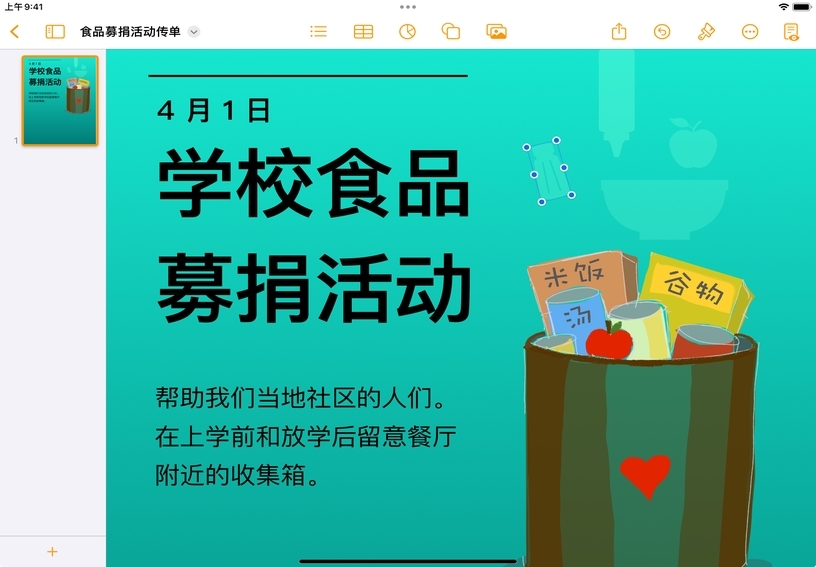 你可以将 Pages 文稿用作空白画布,从头开始设计自己的页面布局。无论是为即将举办的活动设计独一无二的海报或宣传页,为学生制作实用的组织图,还是为班级点名簿设计自定模板,都能轻松实现。