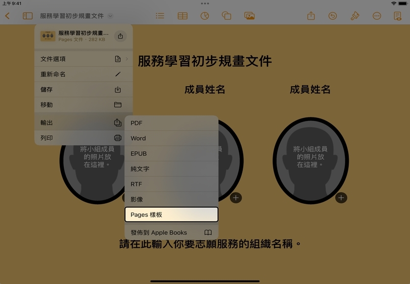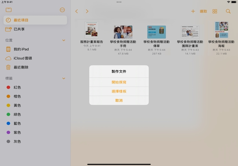 你在 Pages 文件中自訂布局之後,就可以儲存為自訂樣板,以用於日後的計畫案或與他人分享。自訂樣板可以透過 iCloud 同步到所有裝置上,讓你可以在 iPad 上製作樣板並在 Mac 上使用,反之亦然。