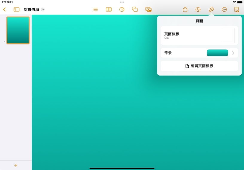 變更背景。點一下左側角落的頁面縮覽圖以選取此頁面。點一下「格式」