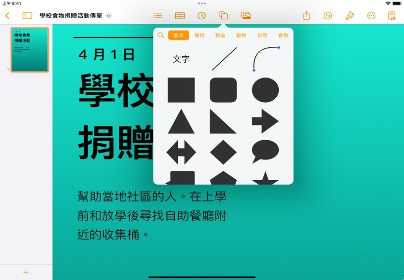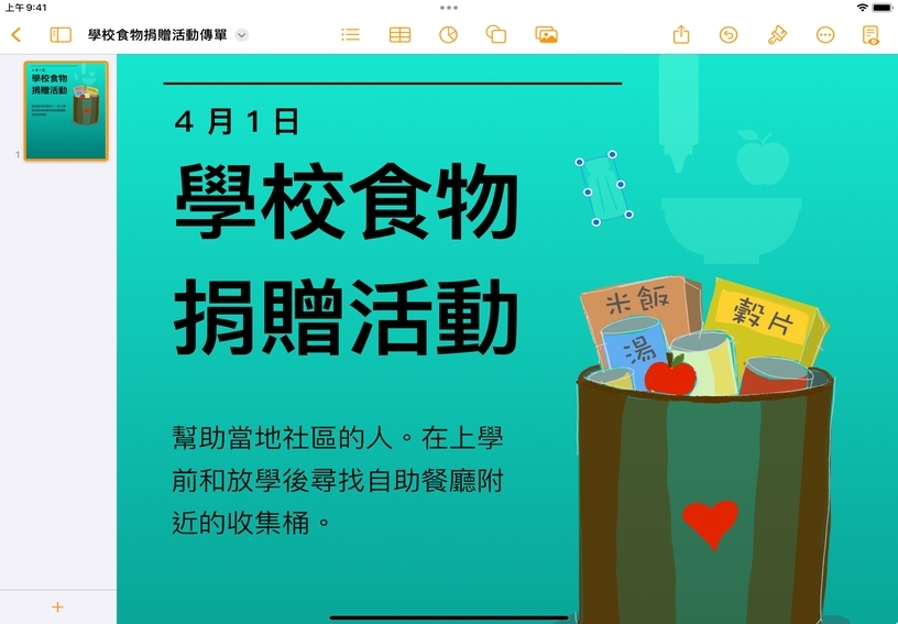 你可以將 Pages 當成空白的畫布,從頭開始自行設計頁面布局。你可以自由地將元件放在任意位置,為即將到來的活動製作獨一無二的海報或傳單、為學生製作圖像組織圖,或為班級書籍設計自訂樣板。