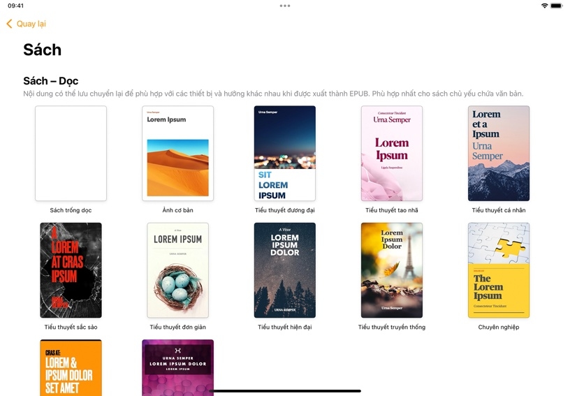 từ trình quản lý tài liệu và duyệt danh mục Sách. Chọn mẫu sách dọc cho cuốn sách thiên về chữ. Mẫu sách ngang phù hợp nhất với sách thiên về hình ảnh và cần bố cục cố định.
