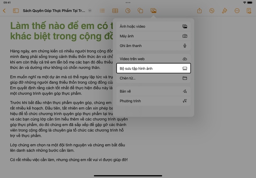 Thêm thư viện ảnh. Chọn một trang có nhiều văn bản. Chạm vào Phương Tiện