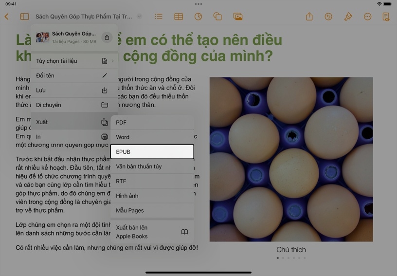 ở góc trên bên trái , chạm vào Xuất, sau đó chạm vào EPUB.