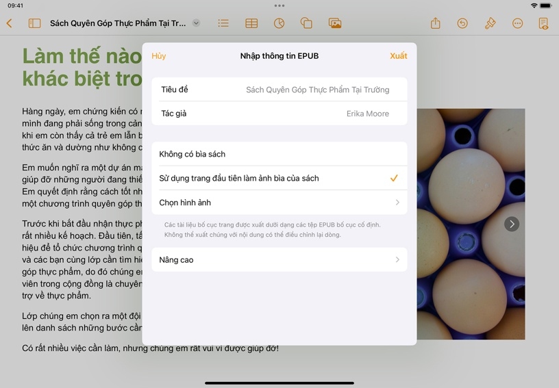 Trong hộp thoại xuất, bạn có thể thêm tiêu đề sách và tên tác giả, chọn ảnh bìa, v.v. Chạm vào Xuất để gửi sách tới cho người khác hoặc để xem sách trong Apple Books.