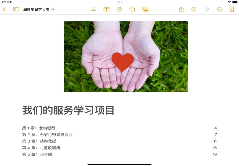 通过添加目录,让读者可以更轻松地浏览数字图书。当你制作图书时,Pages 文稿可以自动生成目录。在数字图书中,目录条目会变为动态链接,读者只需轻轻一点,便能够直接跳到特定的章节和标题。