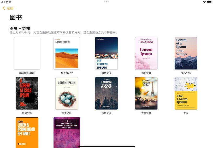 ,然后浏览“图书”类别。针对以文字为主的图书,选取竖版模板。横版模板更适合包含大量图像且需采用固定布局的图书。