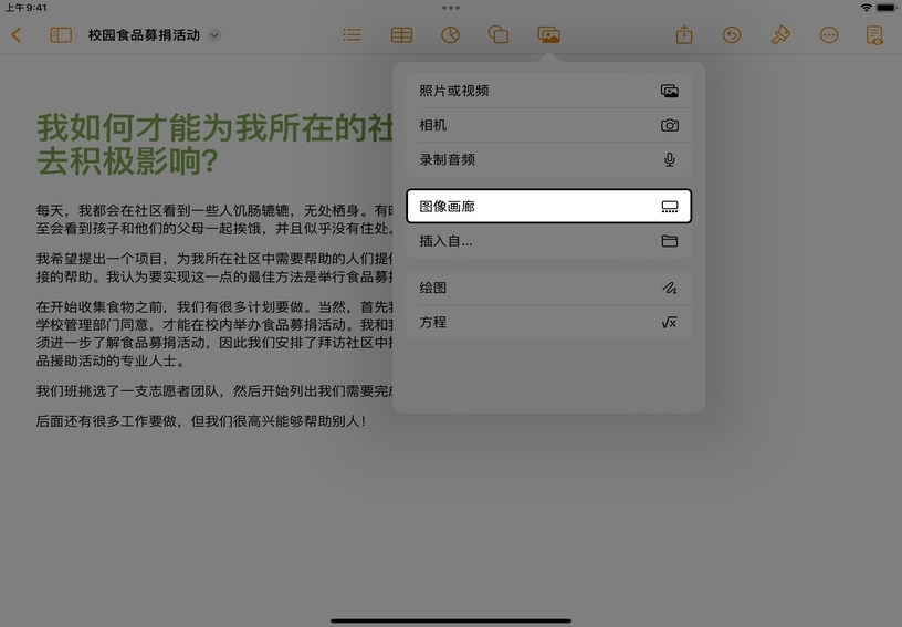 添加图像画廊。选取一个以大量文字内容为主的页面。轻点“媒体”