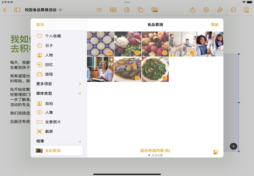 ,轻点“选取照片”,在照片浏览器中选择图像,然后轻点“添加”。