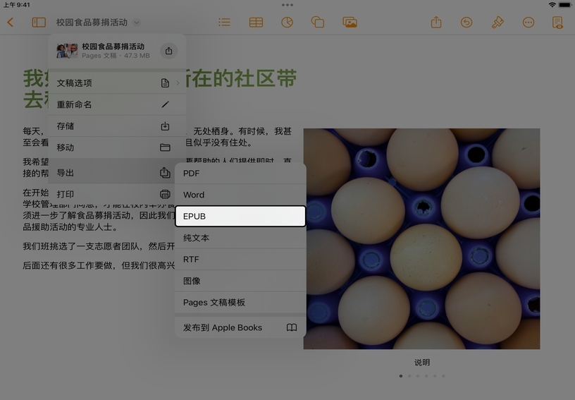 导出图书。当你准备好分享图书后,轻点左上角的“操作菜单”