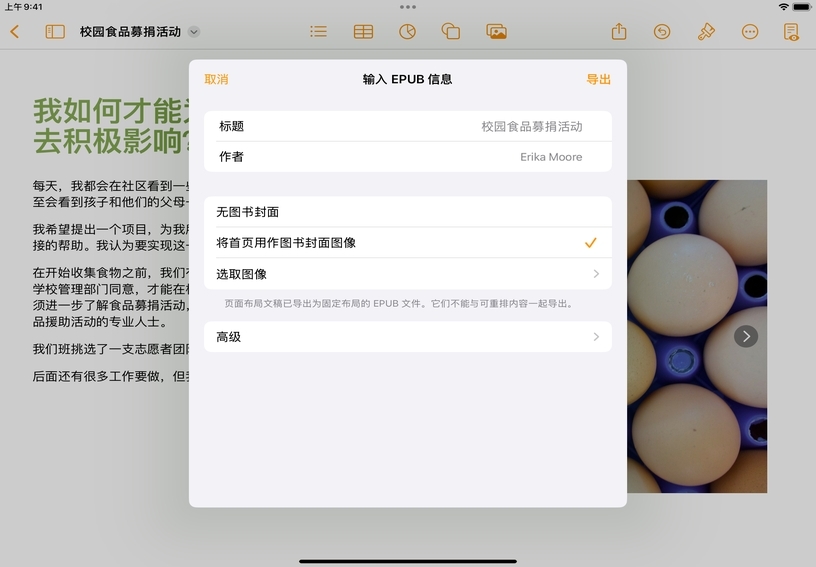 在导出对话框中,你可以添加书名和作者姓名,选取封面等。轻点“导出”,即可将图书发送给其他人,或在 Apple Books 中查看。
