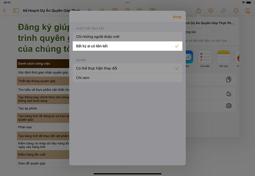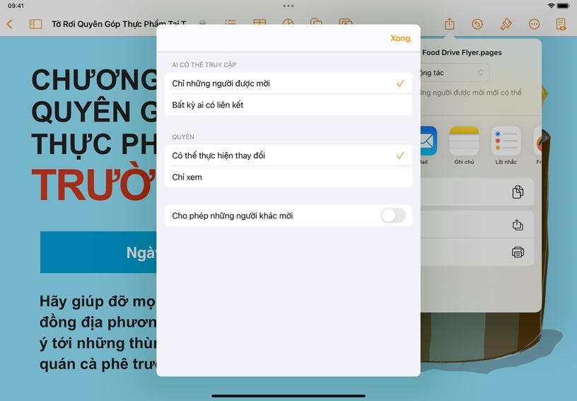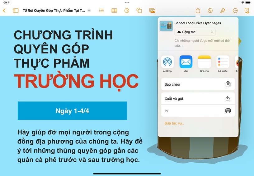 Chọn các tùy chọn chia sẻ. Chạm vào Cộng Tác để thiết lập xem ai có quyền truy cập và chỉnh sửa tài liệu.