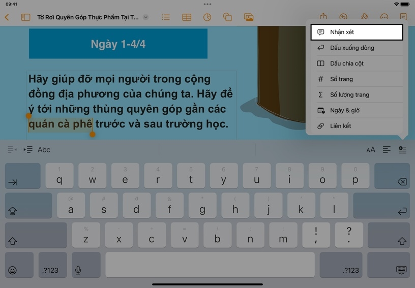 trong thanh phím tắt trên bàn phím, sau đó chạm vào Nhận Xét. Nhập nhận xét của bạn rồi chạm vào Xong.