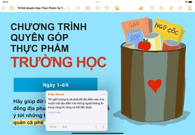 Phản hồi nhận xét. Để xem nhận xét của người cộng tác, hãy chạm vào dấu nhận xét. Chạm vào Trả Lời ở phía dưới nhận xét, nhập câu trả lời của bạn, rồi chạm vào Xong.