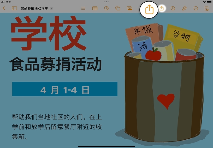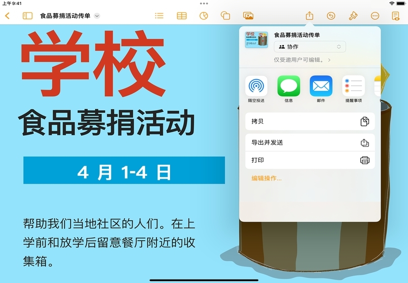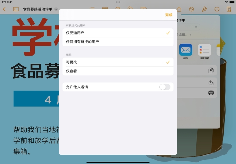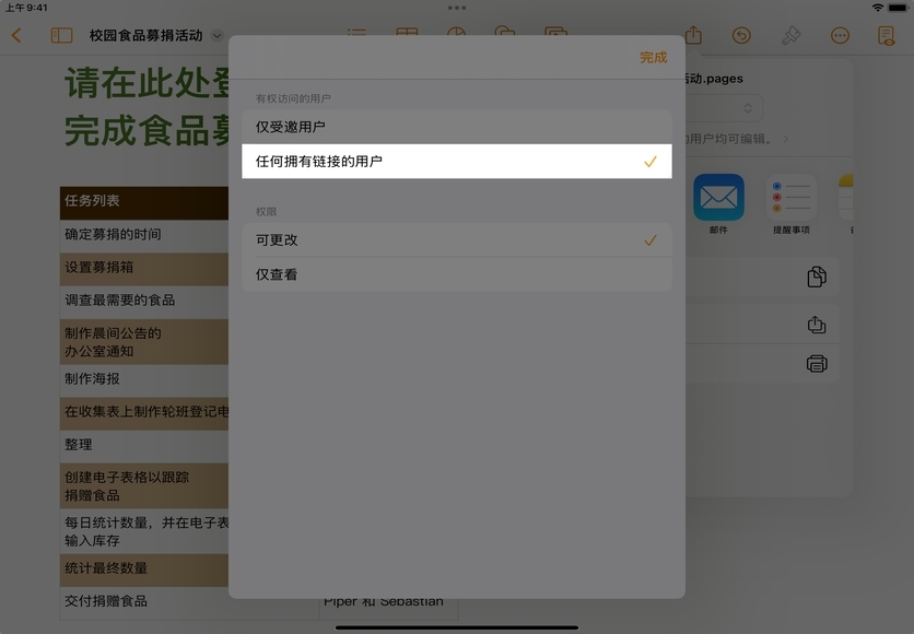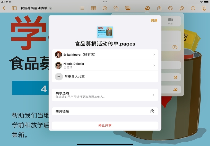 选择共享选项。轻点下面的“协作”,以设置谁可以访问和编辑文稿。