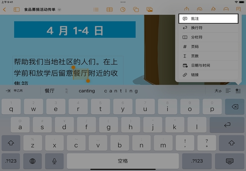 要添加批注以供他人查看,请选择文本或对象,轻点键盘上方快捷栏中的“插入”