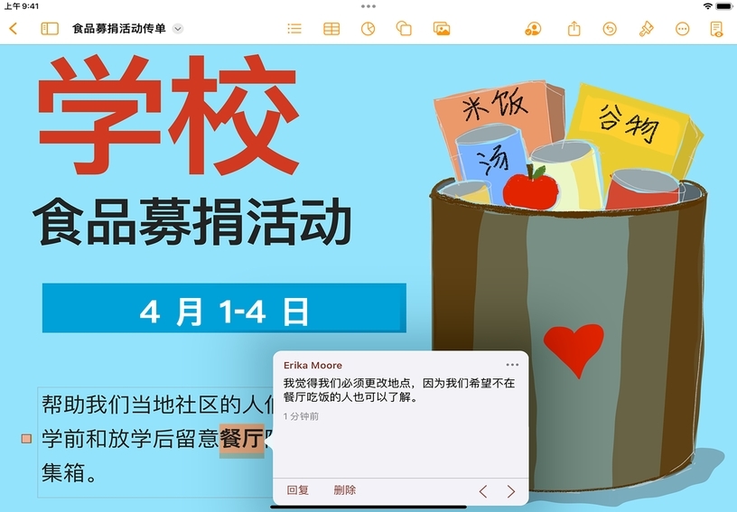 回复批注。要查看协作者留下的批注,请轻点批注标记。轻点批注底部的“回复”,输入你的回复内容,然后轻点“完成”。