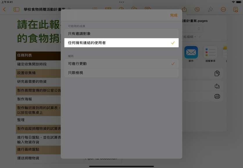 加入或移除合作者。點一下工具列中的「合作詳細資訊」 ,點一下「管理共享的文件」打開參與者列表,然後點一下「與更多人共享」。點一下邀請新參與者的方式,然後點一下「分享」。若要移除合作者,請點一下對方的名字,然後點一下「移除權限」。