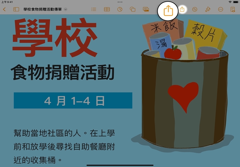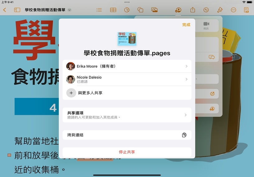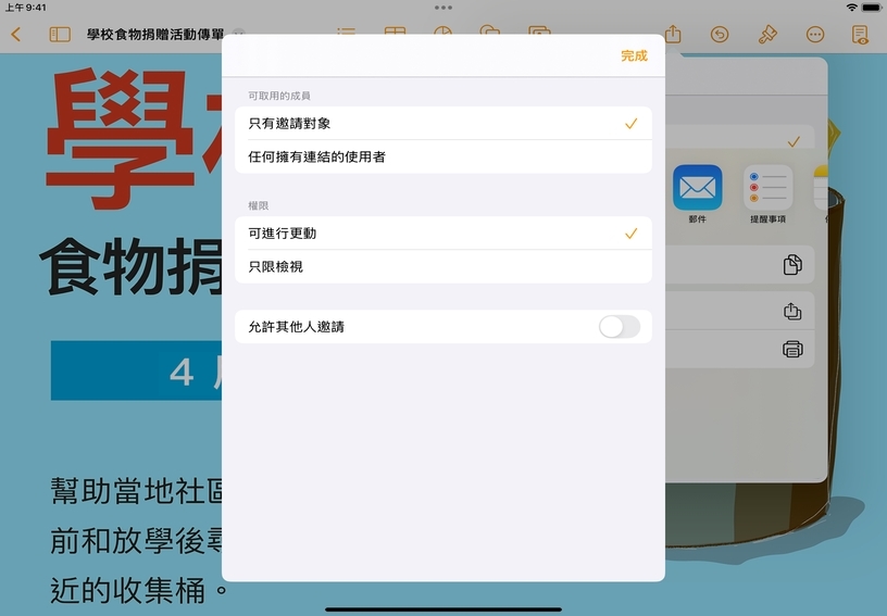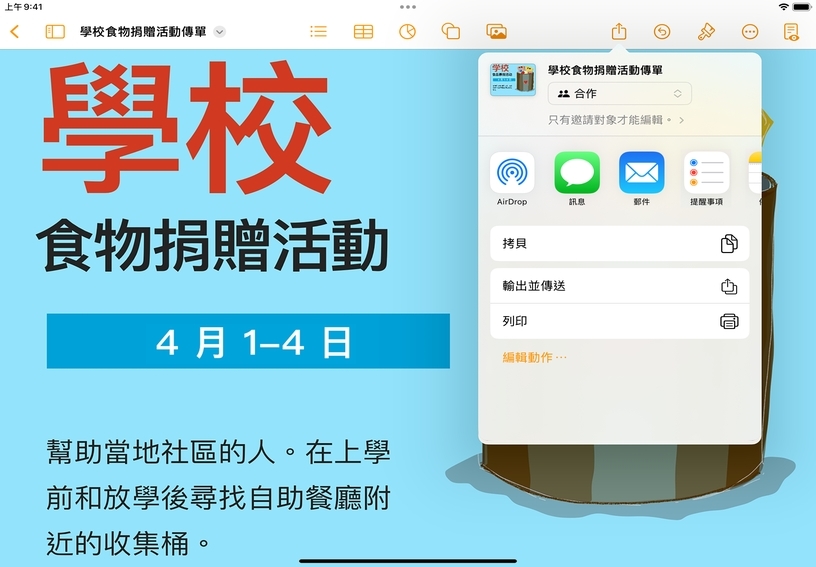 邀請其他人一起合作。點一下工具列中的「分享」 。你必須先在 iPad 上啟用 iCloud 才能邀請其他人合作。