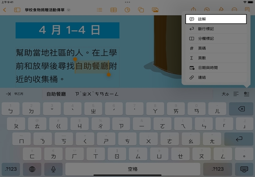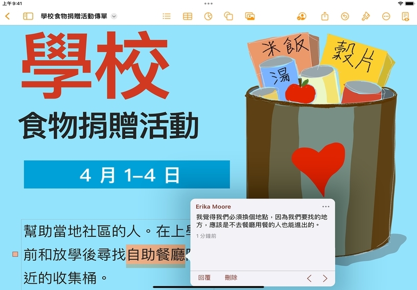 如果想加入可供他人檢視的註解,請選取文字或物件、點一下鍵盤上方快捷鍵列中的「插入」 ,然後點一下「註解」。輸入註解後點一下「完成」。
