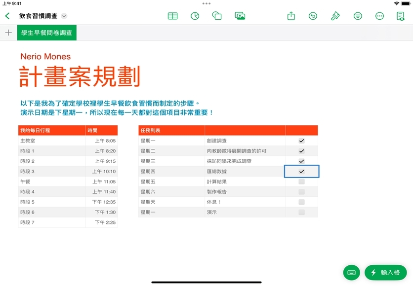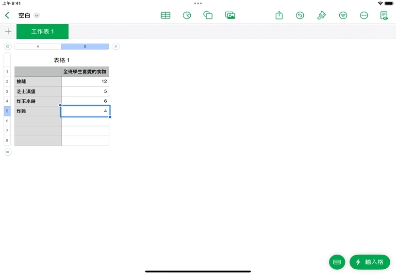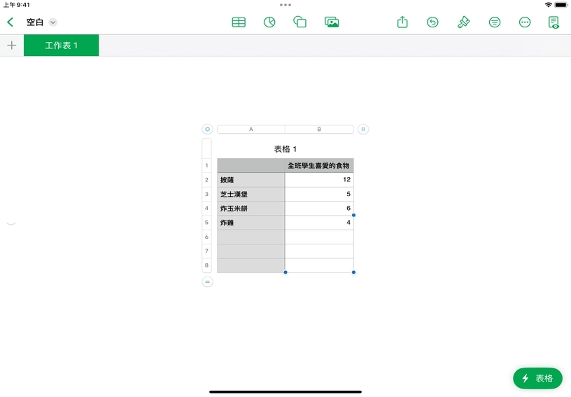所有試算表皆從表格開始,你可以利用表格中的橫列與直欄整理數字、文字和其他類型的資訊。利用表格來記錄實驗結果、列出文學作品中人物的特質、記下腦力激盪構想,以及其他資料。