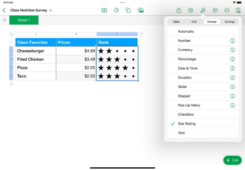 Make your spreadsheets more interactive. With cell formatting options like Star Rating and Pop-Up Menu, you can enter ratings with a simple tap and create customized lists for quick, precise data entry.