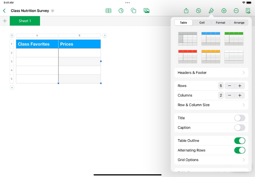 Change how a table looks. Tap the table to select it, tap Format , then tap the Table tab. Choose a table style or edit the settings to create your own.