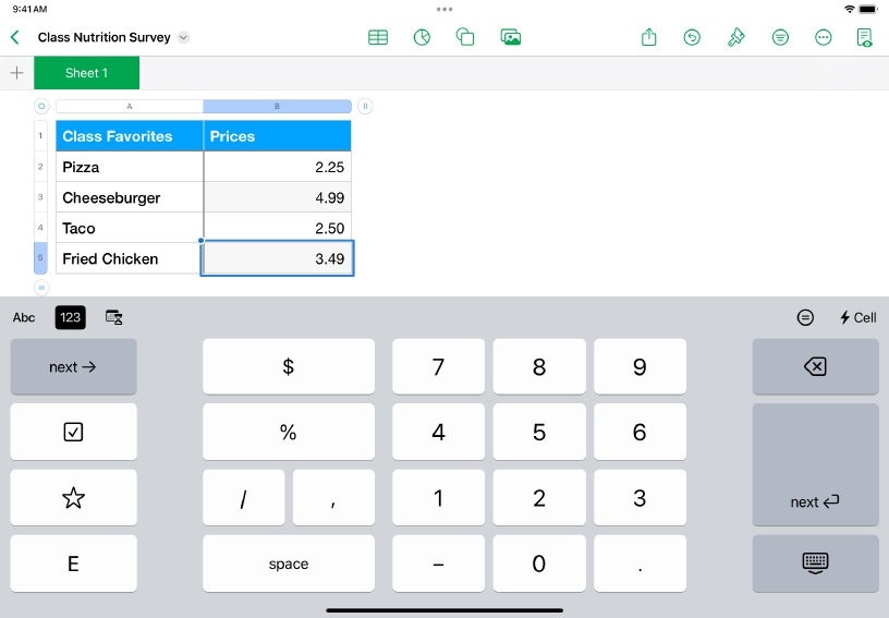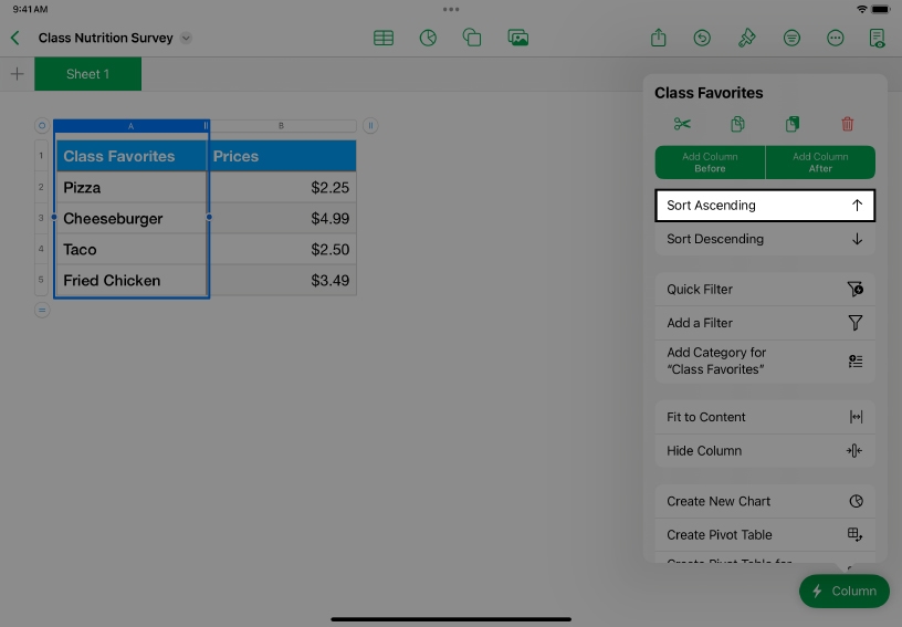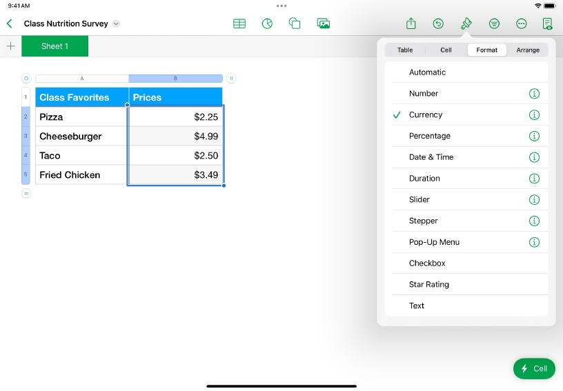 Format data. Select the price column by tapping the letter at the top of the column. Tap Format , then tap the Format tab and choose Currency.