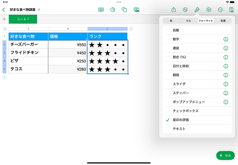 スプレッドシートをもっとインタラクティブにしてみましょう。「星印の評価」や「ポップアップメニュー」といったセルのフォーマットオプションを使うと、タップするだけで評価を入力したり、あらかじめ設定しておいたリストからすばやく正確にデータを入力したりできるようになります。