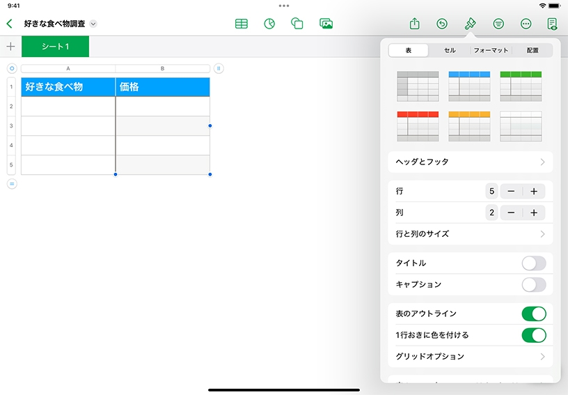 表のデザインを変更してみましょう。表をタップして選択し、フォーマットボタン>「表」タブの順にタップします。表のスタイルを選択するか、設定を編集して自分の好きなスタイルを作成してください。
