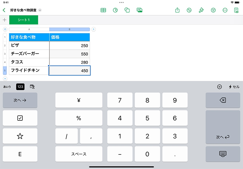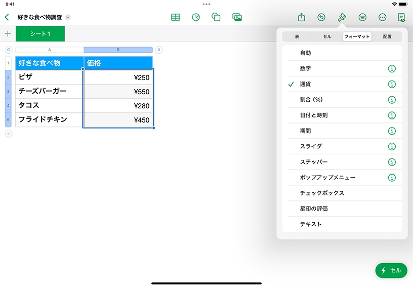 データのフォーマットを設定してみましょう。列の一番上にある文字をタップして、価格の列を選択してください。フォーマットボタン>「フォーマット」タブの順にタップし、「通貨」を選択します。