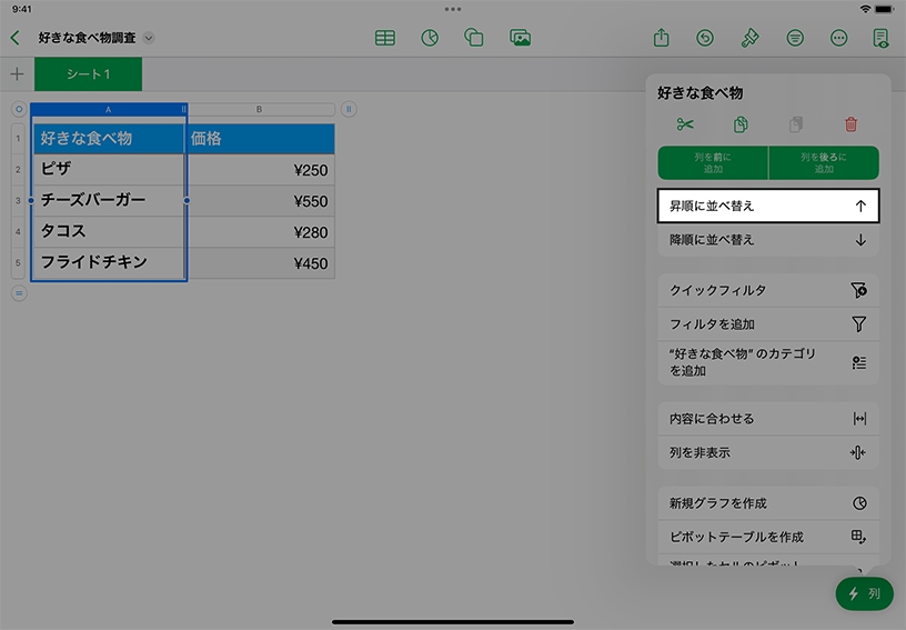 表のデータをアイウエオ順に並べ替えてみましょう。項目が入力されている列を選択してください。メニューから「列アクション」を選択するか、列アクションボタンをタップして、メニューの中から「昇順に並べ替え」を選択します。