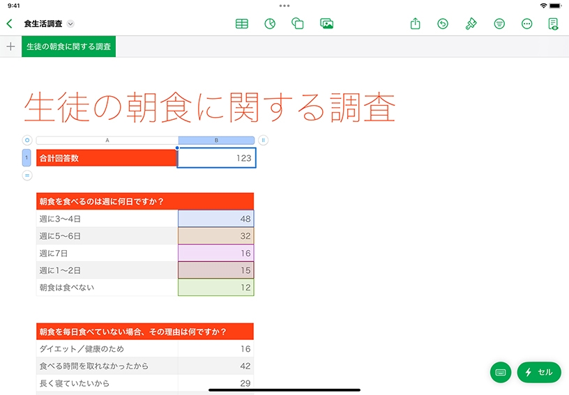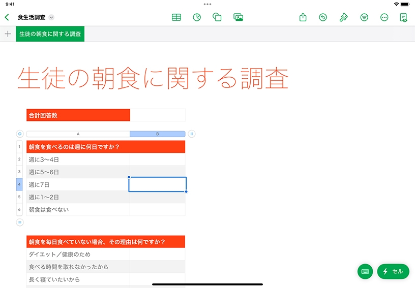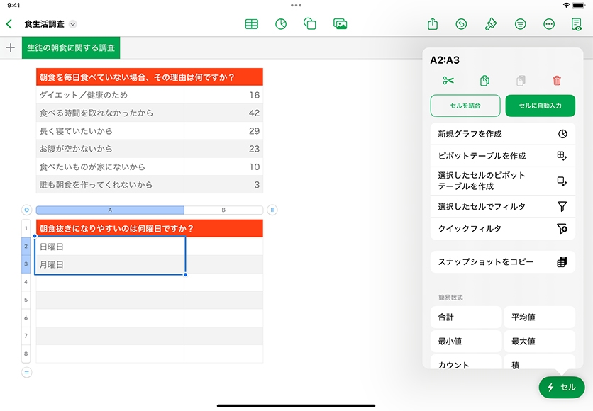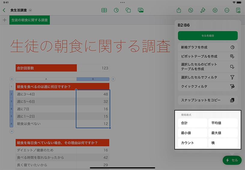 特定の範囲内にあるセルの数値を使って簡単な計算を実行してみましょう。セルをタップしてから青色の点をドラッグして、セルの選択範囲を広げます。セルのアクションボタンをタップし、合計、積、平均値といった簡易数式を選択してください。