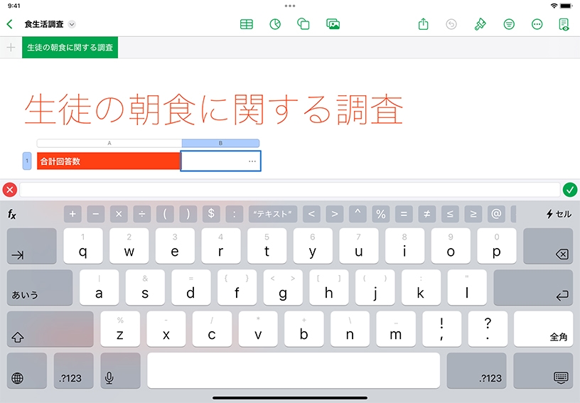 数式キーボードを開いてみましょう。数式を追加するセルをタップして、キーボードボタンをタップし、さらにキーボードの右上にある数式キーボードボタン