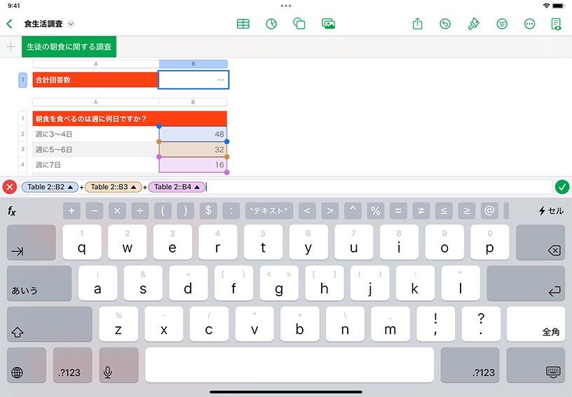 数式を作ってみましょう。表の別のセルにある値を数式に含める場合は、そのセルをタップすると、数式からそのセルが参照されるようになります。ほかの数字や演算子を追加することもできます。OKボタンをタップして、数式を完成させてください。