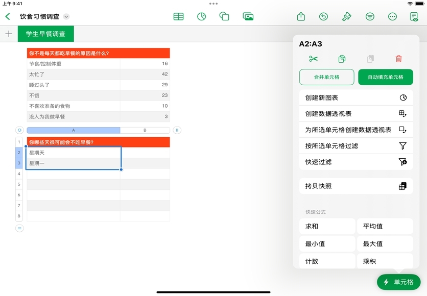 你可以使用“自动填充”功能,快速将相同的公式、数据或具有逻辑顺序的数据填充到单元格中。尝试使用“自动填充”功能填写日历:先输入一个月份中的前两个日期,然后选中这两个单元格,轻点“单元格操作”,再使用“自动填充”填充剩余的单元格。