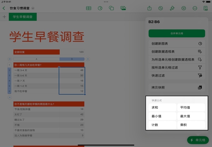 ,然后选择快速公式,例如“求和”、“乘积”或“平均值”。