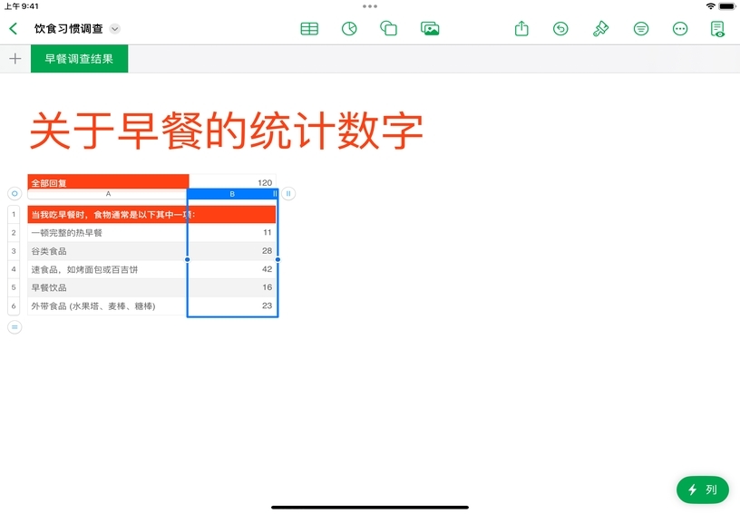 选择数据。轻点你要纳入图表的数据所在列或行的顶部位置。