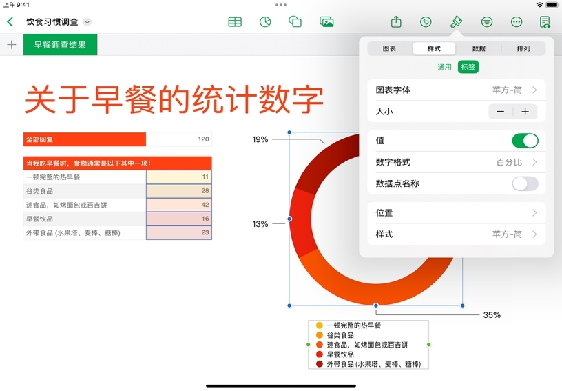 ,然后选取图表样式并修改标签、颜色、字体或图表类型。