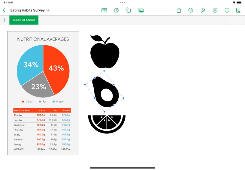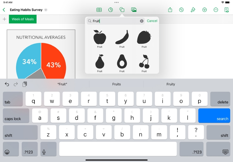 Numbers includes hundreds of shapes that you can colour, customize, and combine however you like. Use shapes to represent complex processes, build a timeline of events, or show a summary of your results.