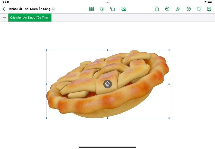 Bạn có thể thêm các đối tượng 3D được tạo bằng phần mềm 3D hoặc quét 3D ở các định dạng tệp USDA, USDC và USDZ vào bảng tính của mình. Sau khi thêm đối tượng 3D, bạn có thể thay đổi kích thước, phát hiệu ứng nhúng và xoay đối tượng đó theo trục x, y và z.