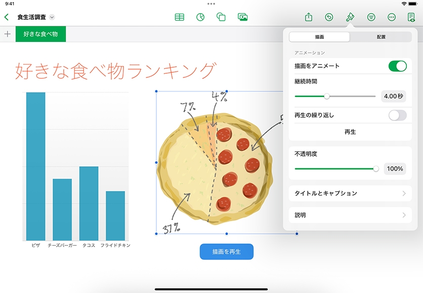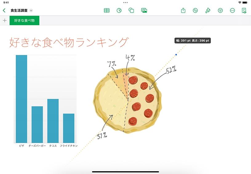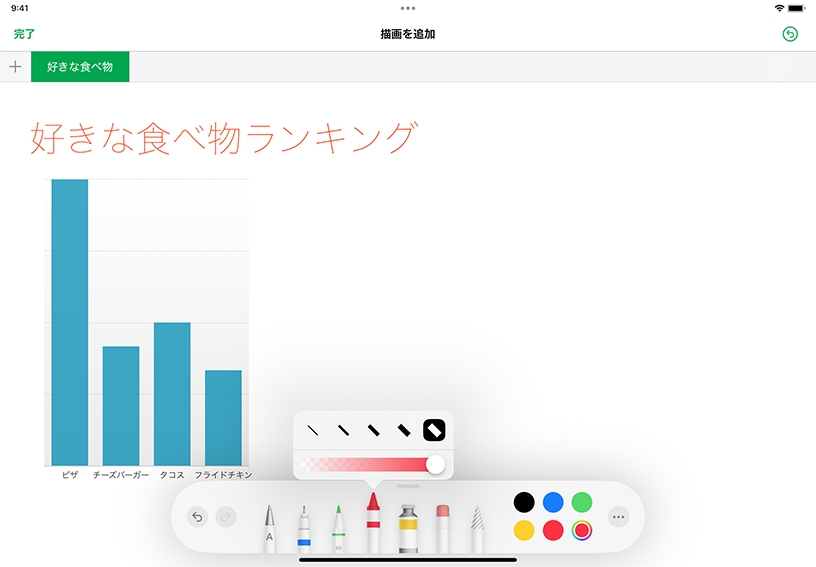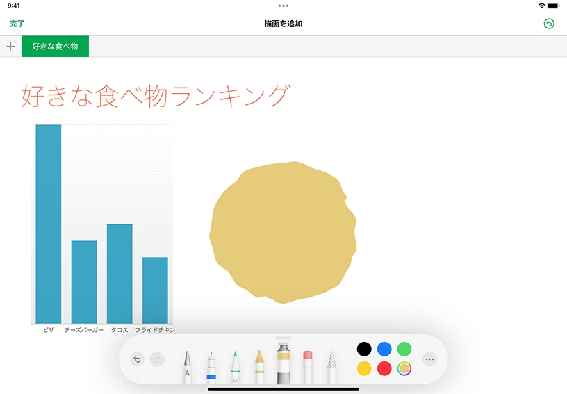 Apple Pencilや指で描いた、カラフルな描画や手書きの文字をスプレッドシートに追加できます。描画ツールを使って、図をスケッチしたり、重要なデータポイントをハイライトしたり、グラフに手書きのラベルで注釈を付けたりしましょう。