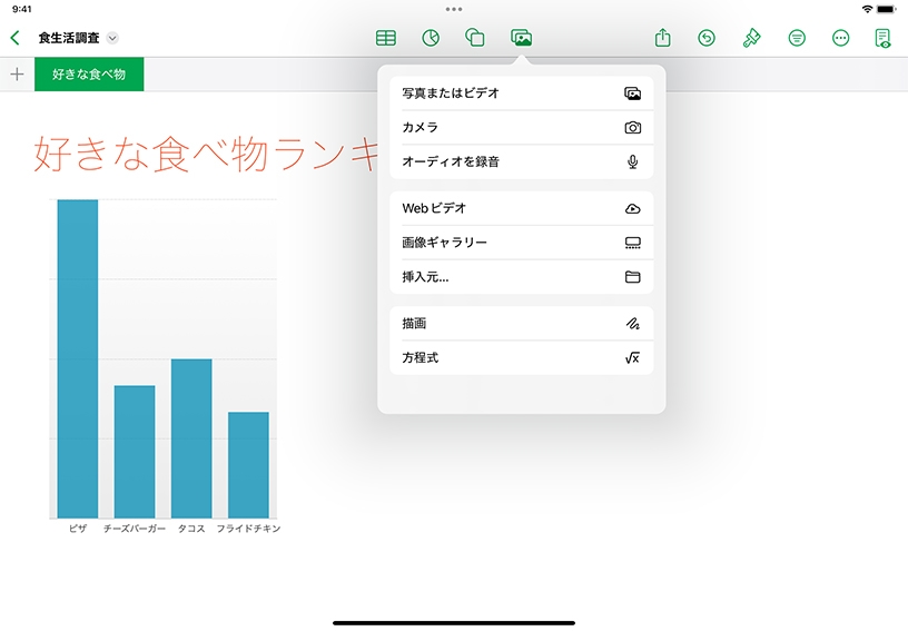 描画を追加してみましょう。Apple Pencilを使う場合は、そのままスプレッドシートに描き始められます。指で描く場合は、メディアボタンをタップして、「描画」を選択してください。
