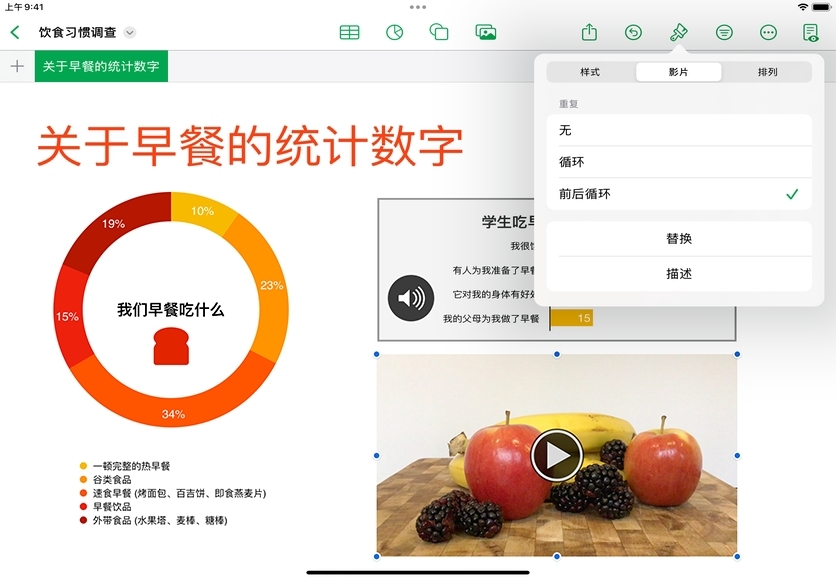 设置播放选项。轻点以选择文稿中的影片或音频录音,然后轻点“格式”
