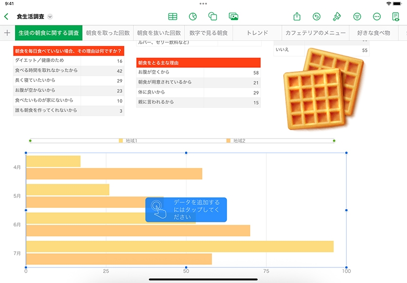 ツールバーを利用して、新しいシートに表、グラフ、図形などのオブジェクトを追加してみましょう。