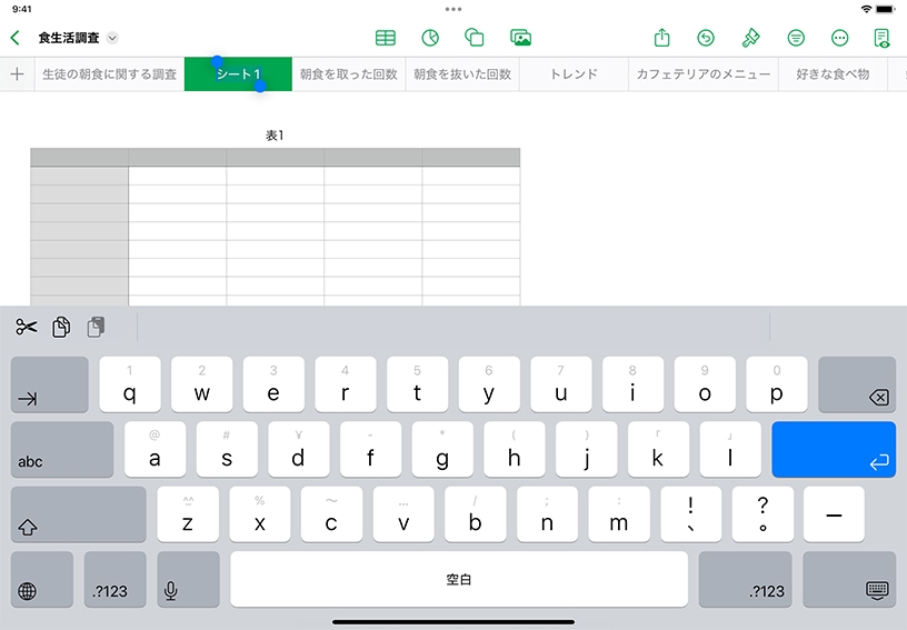 シートの名前を変更してみましょう。シートの名前をダブルタップすると挿入ポイントが表示されるので、新しい名前を入力します。