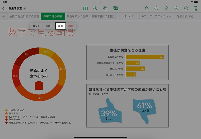 シートを複製するには、現在開いているタブをタップして、「複製」をタップします。