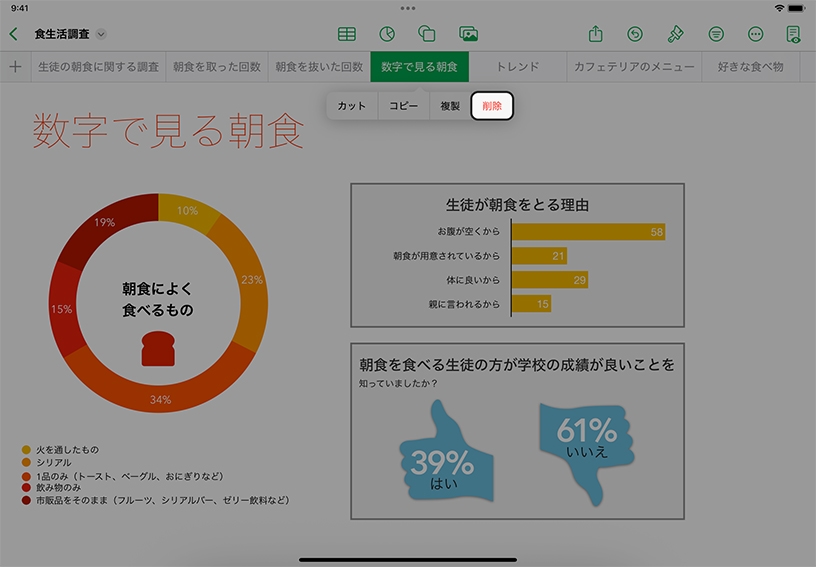 シートを削除するには、現在開いているタブをタップして、「削除」をタップします。