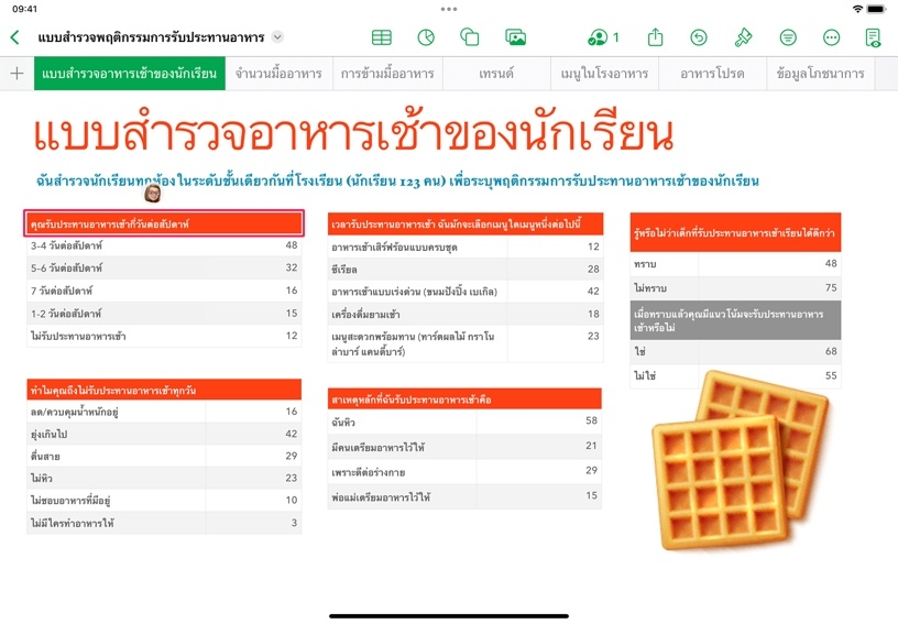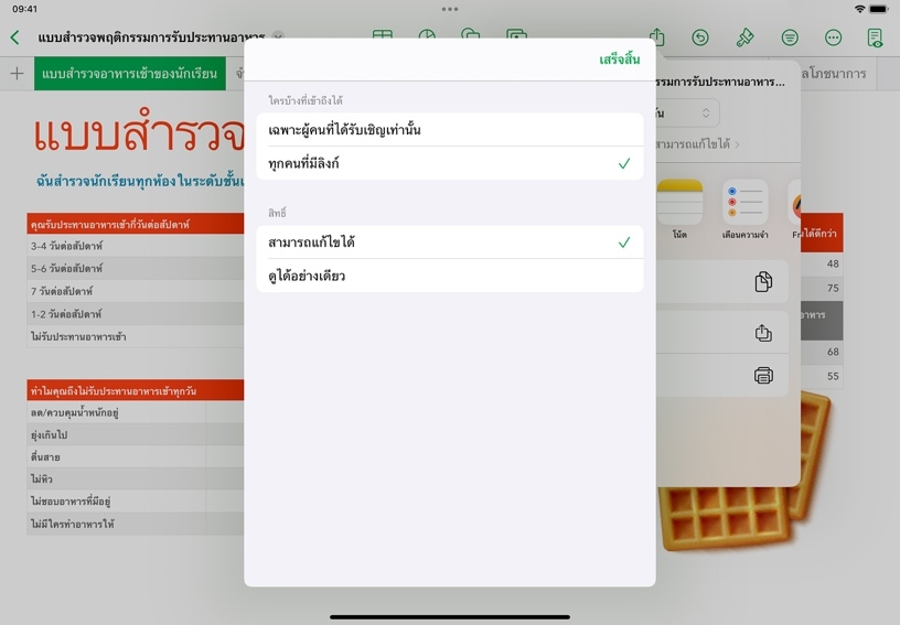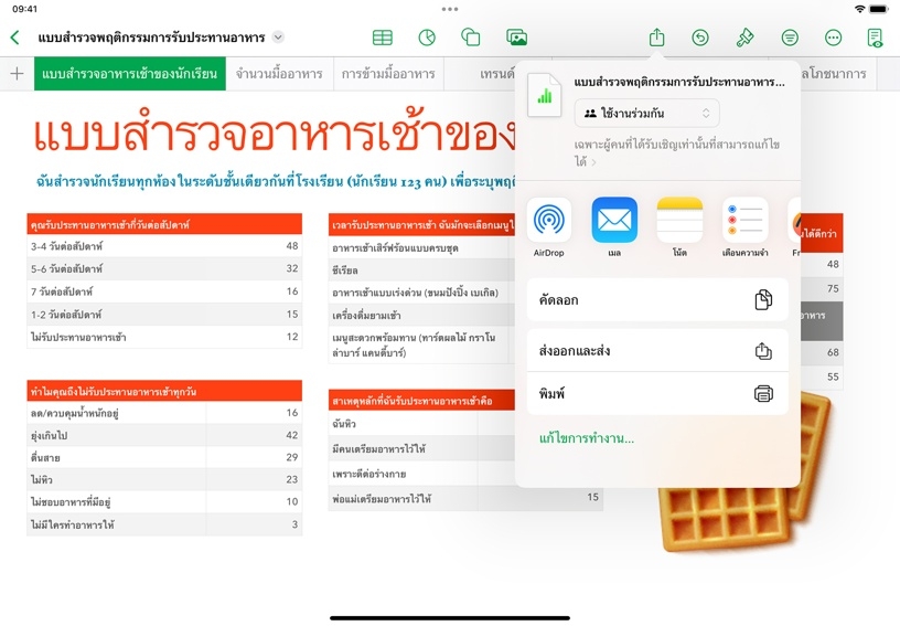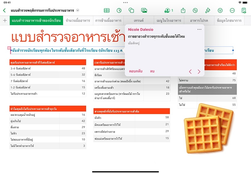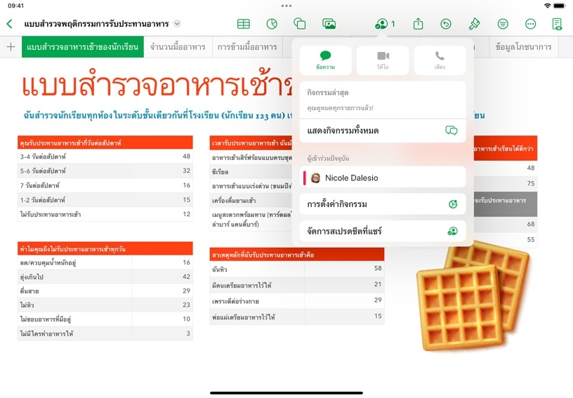 คุณสมบัติการทำงานร่วมกันใน Numbers ให้คุณเชิญคนอื่นมาแก้ไขและมีส่วนร่วมในสเปรดชีตได้แบบเรียลไทม์ คุณสามารถขอความคิดเห็นที่มีต่อผลงานจากเพื่อนร่วมงาน วางแผนโครงการร่วมกัน หรือแจ้งความคืบหน้าให้คนอื่นได้รับทราบโดยให้สิทธิ์ดูอย่างเดียวในสเปรดชีตก็ได้