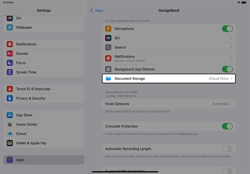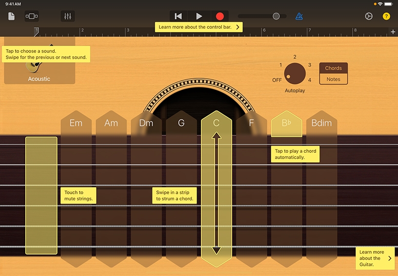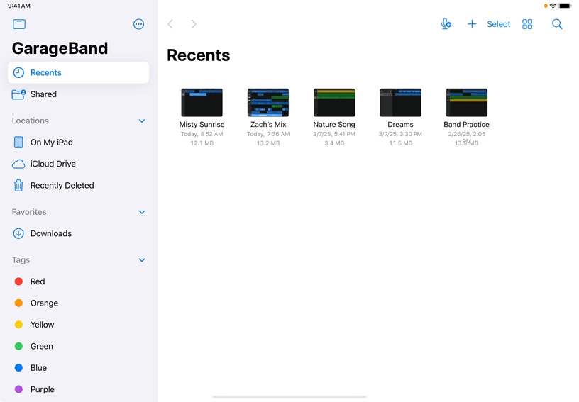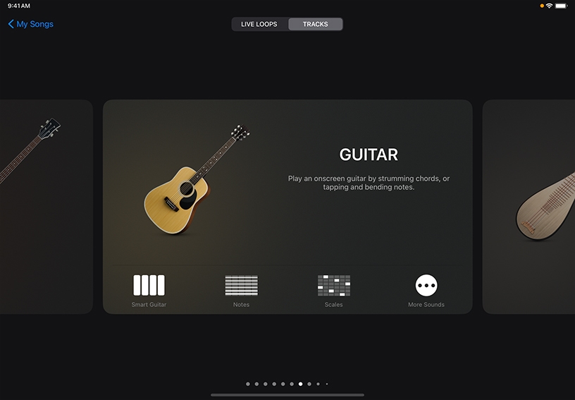 My Songs is where you create and manage your GarageBand projects. After you create a new project, you can browse Touch Instruments and explore hundreds of fun instruments with sounds that evoke different time periods, moods, and cultures.