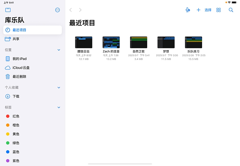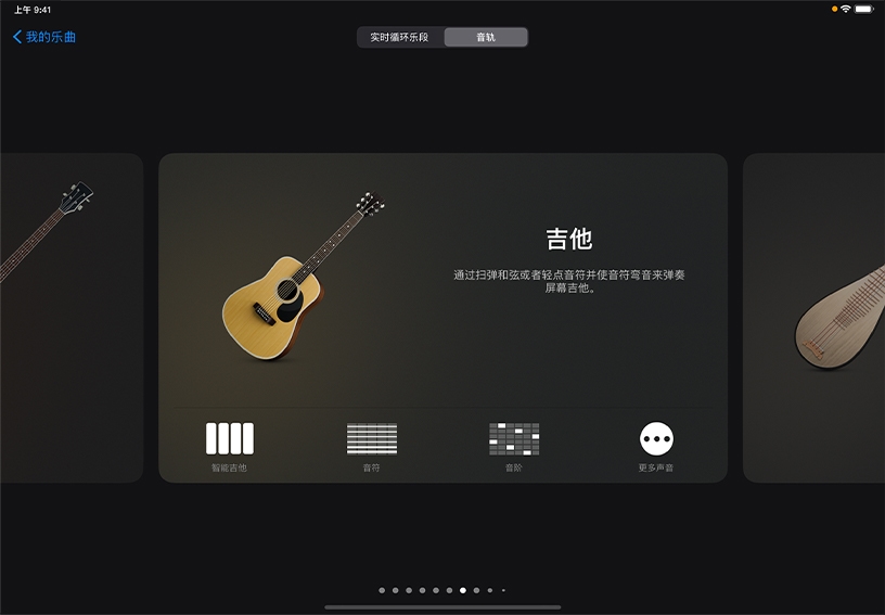 在“我的乐曲”中,可以创建和管理“库乐队”项目。创建新项目后,你可以浏览触控乐器,探索数百种独具魅力的乐器。这些乐器所发出的声音,能唤起人们对不同时代、多样心情以及多元文化的联想。